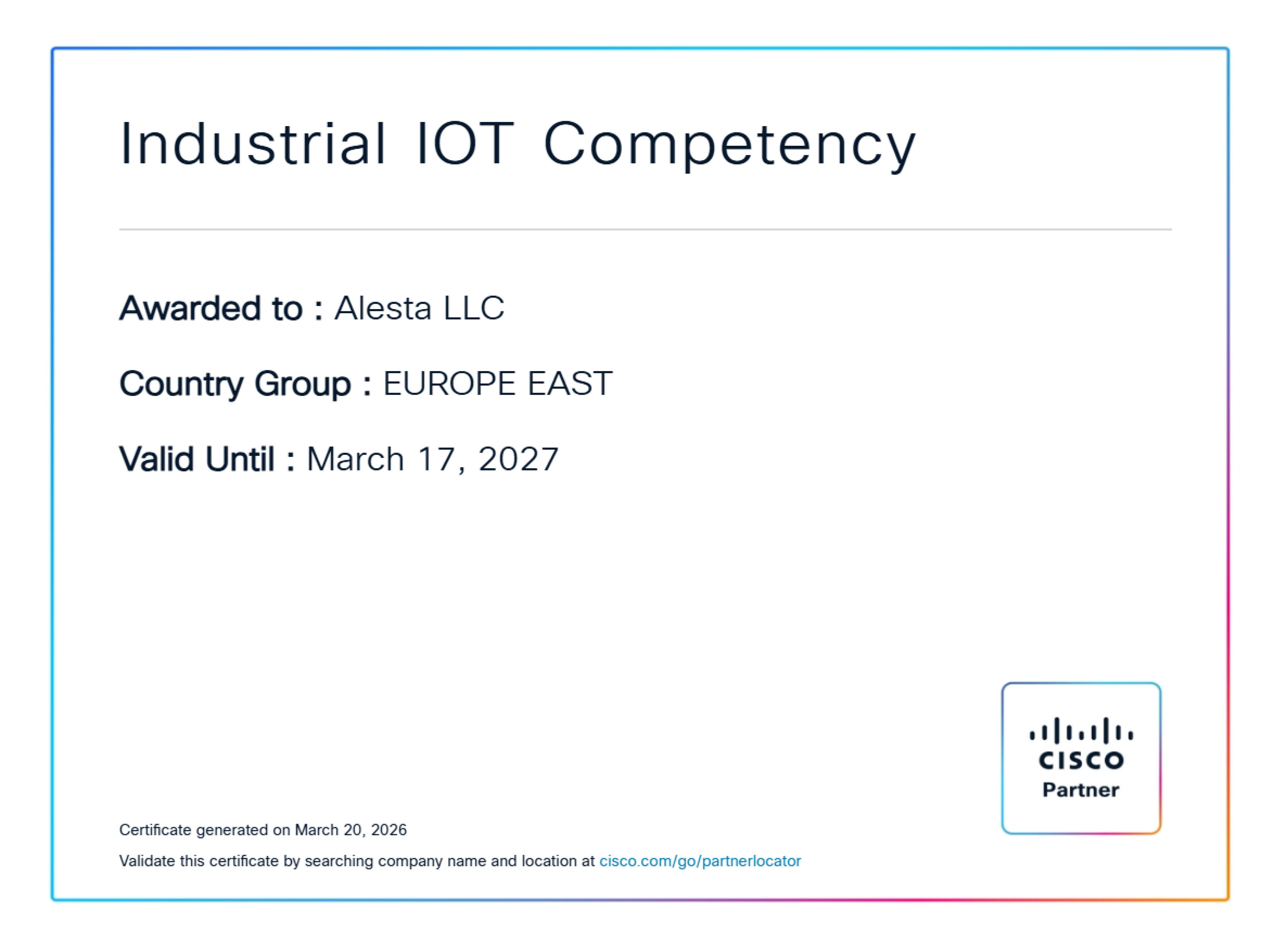ALESTA LLC proudly announces that it has become the first and only systems integrator in Ukraine to achieve the prestigious Cisco Industrial IoT (IIoT) Competency.